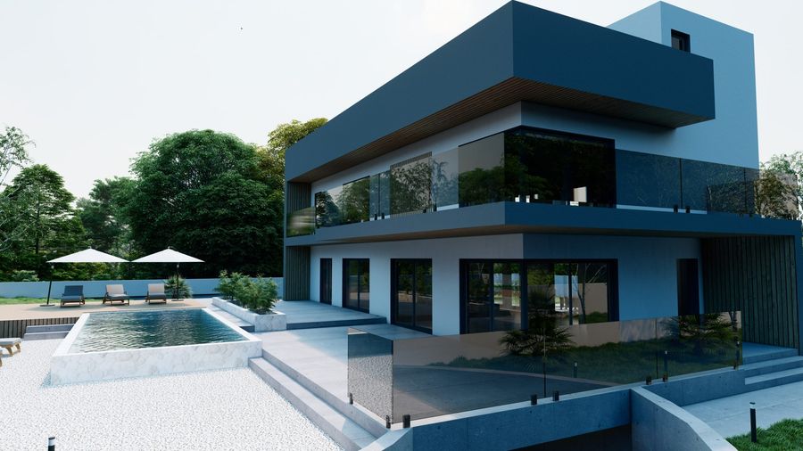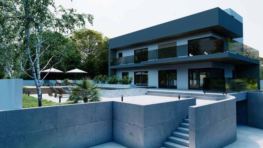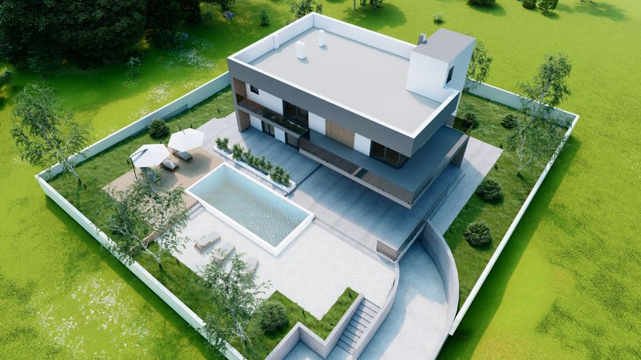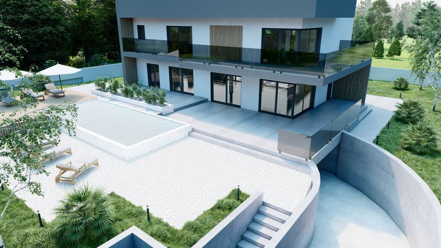 Stambena građevina katnosti Po+Pr+1 s jednom stambenom jedinicom i vanjskim bazenom. Podrum se sastoji od garaže s 2 parkirna mjesta, strojarnice, gusterne, konobe, wc-a, ostave, unutarnjeg stepeništa i vanjskog stepeništa. Prizemlje se sastoji od ulaza, dnevnog boravka, blagovaone, kuhinje, wc-a i stepeništa. Kat se sastoji od hodnika, 4 spavaće sobe od kojih jedna ima garderobu, praonicu i kupaonicu. Djelom natkrivena krovna terasa sa šankom.