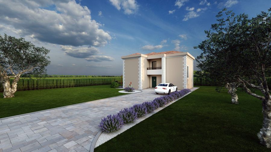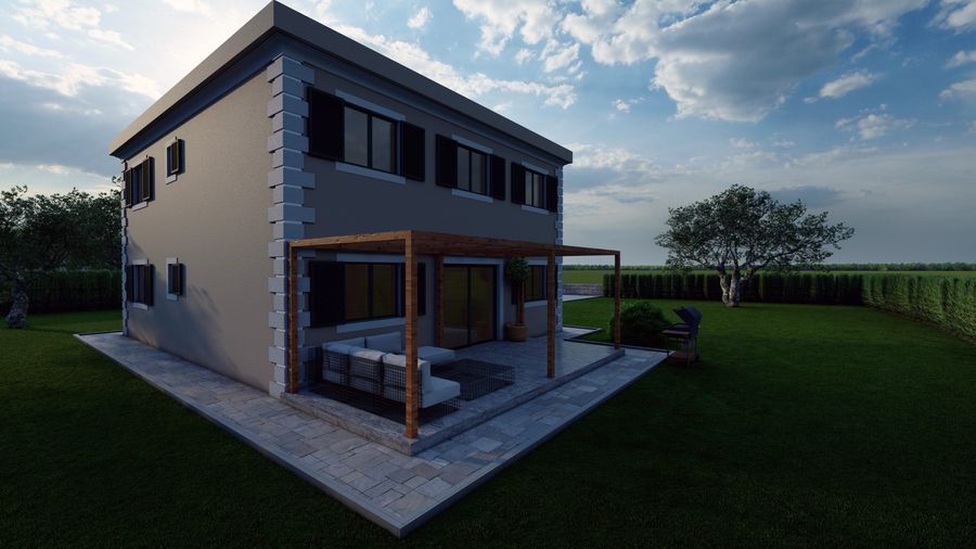 Moderna dvoetažna kuća ukomponirana je tako da sa okućnicom i zonom za parking formira stambenu cijelinu.